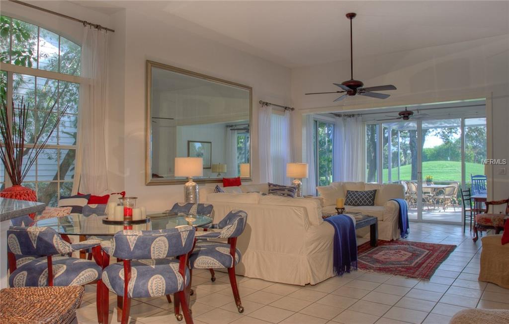 Beautiful decorating in this large villa with expansive views over the University Park golf course. All tile floors and large screened lanai overlooking the greens and sand trap. High end decorating in all the rooms, all tastefully coordinated. The villa has a king sized bed in the master bedroom, in the second bedroom there are two twin sized beds, then in the office/den there is a couch with a queen sized fold out bed. Off the kitchen there is a barbeque patio for ease of entertaining. The detached garage features installed cabinets for extra storage. Great location for your vacation on the exquisite golf course of University Park. UNIVERSITY PARK/ SEASONAL VILLA /SARASOTA/ BRADENTON FLORIDA